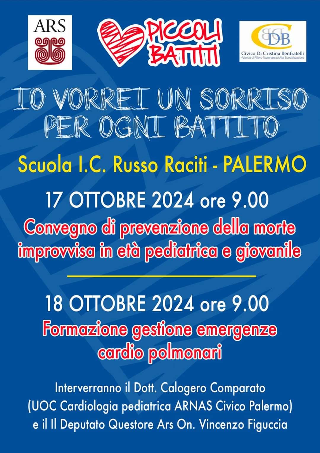 In data 17 e 18 Ottobre 2024 grazie alla collaborazione dell’A.R.S. e della U.O.C. Cardiologia pediatrica ARNAS Civico di Palermo, presso l’I.C. Russo Raciti di Palermo, si è svolta la manifestazione culturale atta alla prevenzione delle morti improvvise in età giovanile ed alla formazione di squadre atte alla gestione delle emergenze cardio polmonari